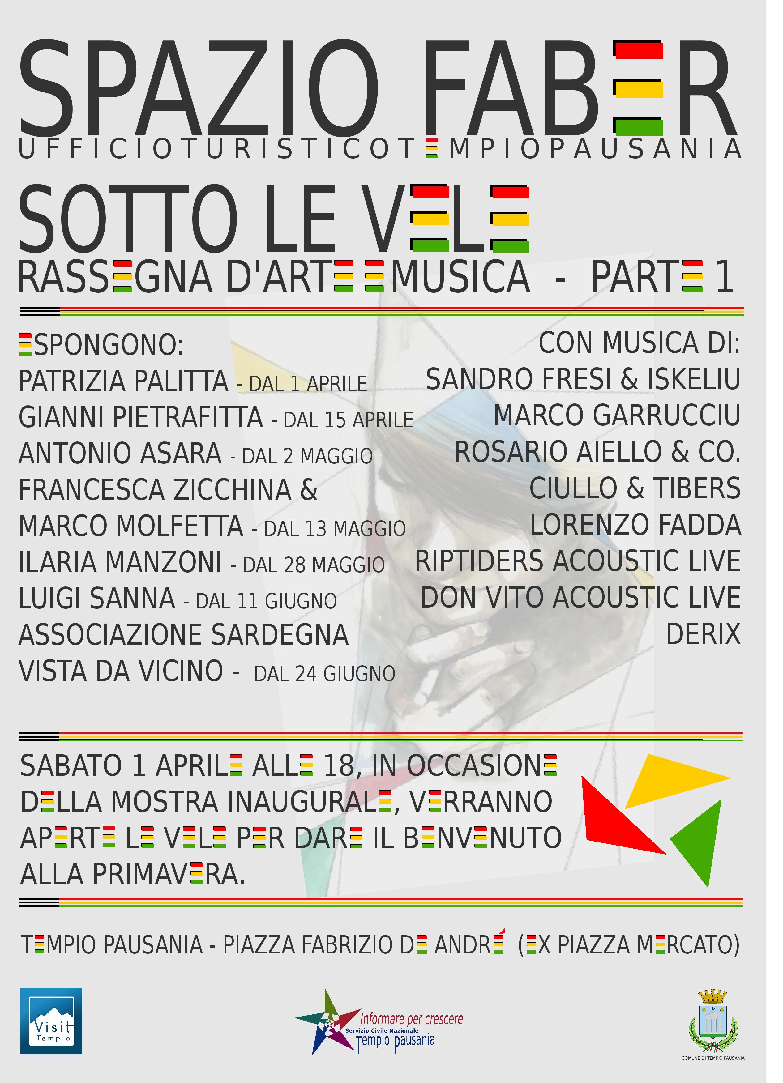 La cerimonia di riapertura delle vele nella piazza Fabrizio De Andrè, fissata per sabato 1 Aprile, sarà accompagnata dall’inaugurazione, nei locali dello spazio Faber, della Rassegna d’arte “Sotto le Vele” . Il progetto, che andrà avanti fino al 30 Settembre, coinvolge diversi artisti (amatoriali e non), che esporranno, con cadenza bisettimanale, in genere il sabato, le loro opere. L’inaugurazione di ogni mostra sarà arricchita da un musicista che eseguirà il proprio repertorio.
