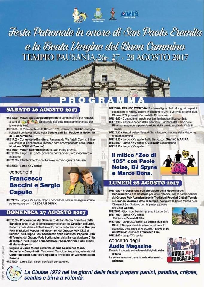 E’ stato ufficializzato il programma della grande Festa Patronale di Tempio, dedicata a San Paolo Eremita e alla Beata Vergine del Buoncammino, e che si svolgerà come sempre a fine agosto: il 26, 27 e 28 agosto 2017. Dal punto di vista del programma religioso sabato pomeriggio, a partire dalle ore 17:00 si svolge il corteo della bandiere con la loro benedizione e Santa Messa finale. Domenica mattina è invece la volta della processione nel centro storico in onore di San Paolo Eremita accompagnata dai gruppi folk con partenza alle ore 10:30. Lunedì invece ancora processione ma stavolta dedicata alla Madonna di Buoncammino, anch’essa accompagnata dai gruppi folk (partenza sempre alle ore 10:30). Per quanto riguarda il programma non religioso, qui di seguito la locandina della festa.
