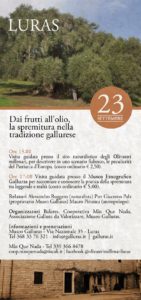 Si parte sabato 23 Settembre alle ore 11.00 a Luogosanto con la visita del Palazzo di Baldu e del Giardino del Re. Alle ore 15.00 a Luras ci sarà una visita guidata al sito naturalistico degli Olivastri Millenari e si prosegue alle ore 17.00 presso il Museo Etnografico Galluras.