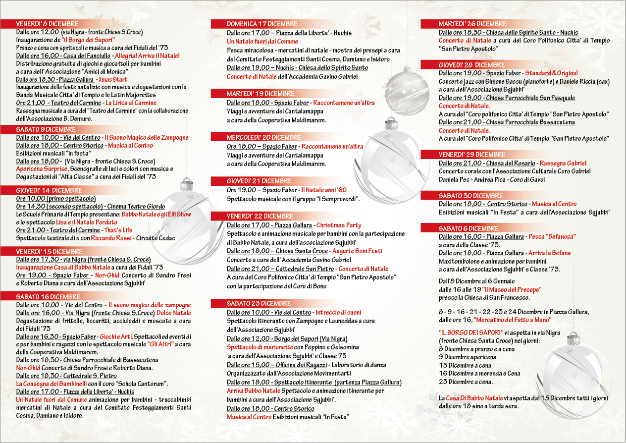 Xmas Tempio 2017: il programma dell’evento natalizio tanto atteso da Valentina Piredda | Dic 6, 2017 | Eventi Tutto pronto a Tempio Pausania per un’edizione natalizia spettacolare. Si tratta di un programma ricco di iniziative con allestimenti artistici davvero spettacolari. Venite a visitare la città di Pietra dall’8 Dicembre al 6 Gennaio. Vi aspettiamo. Condividi:FacebookTwitterPinterestTumblrWhatsApp Correlati