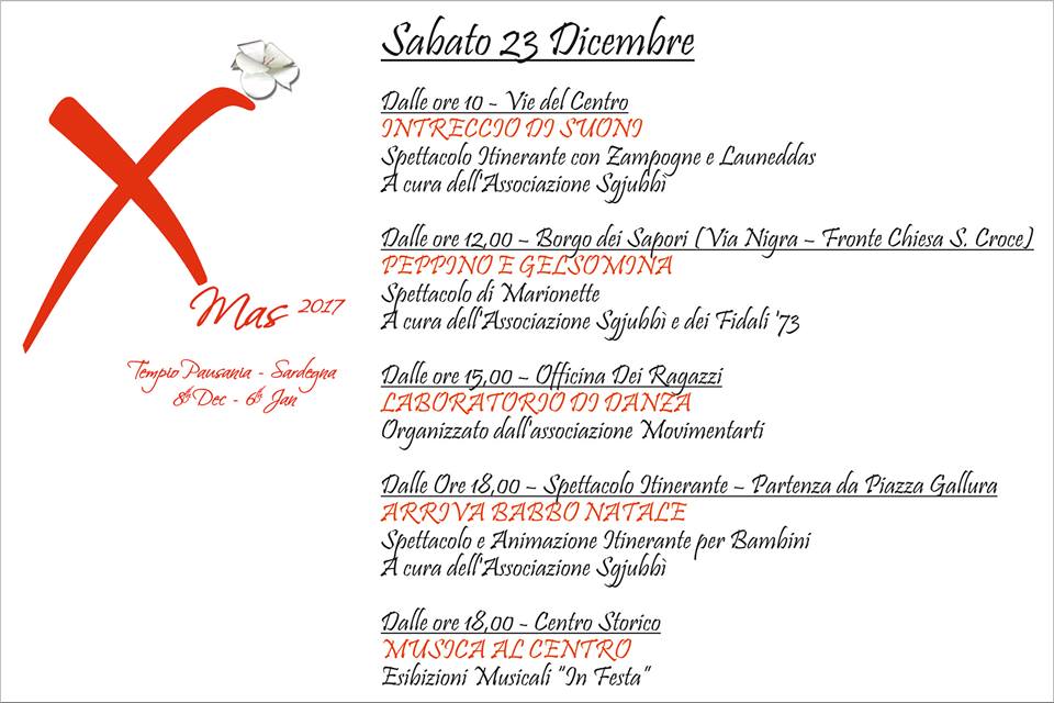 La musica è gradita protagonista anche nella giornata di Sabato 23 dicembre, dalle ore 10:00 nelle colorate vie del centro, con “Intreccio di suoni”. Uno spettacolo itinerante di Zampogne, Launeddas e Cornamusa, un incontro di antiche melodie, con strumenti di culture diverse che si fondono in un unico magico suono, che accompagnerà Babbo Natale per le vie del centro cittadino.