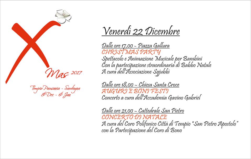La serata si conclude accompagnata dalle melodie dei cori polifonici; alle ore 21:00, nella sacra atmosfera della Cattedrale di San Pietro, ci sarà il Concerto di Natale, cui parteciperanno il Coro Polifonico Città di Tempio “San Pietro Apostolo”, accompagnato dal Coro di Bono.