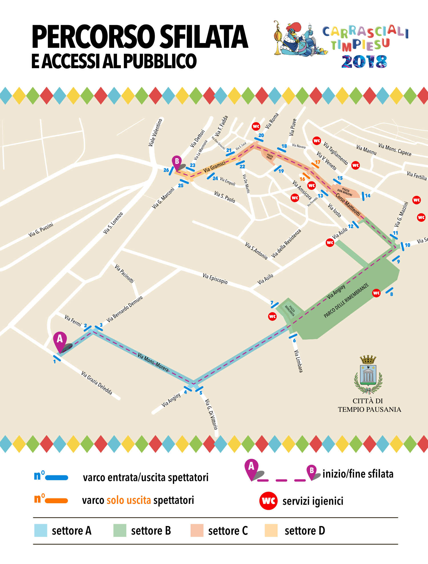 Mettiamo inoltre a disposizione una mappa sulla quale sono segnalati i punti di accesso alle sfilate e la dislocazione dei servi igienici.