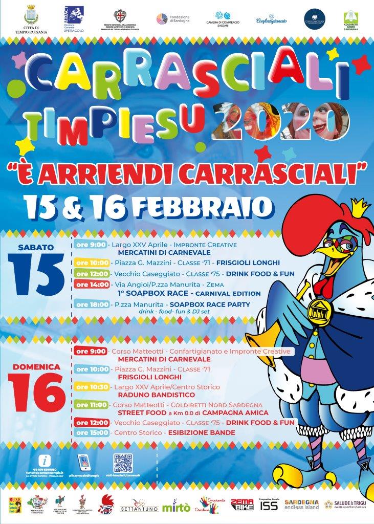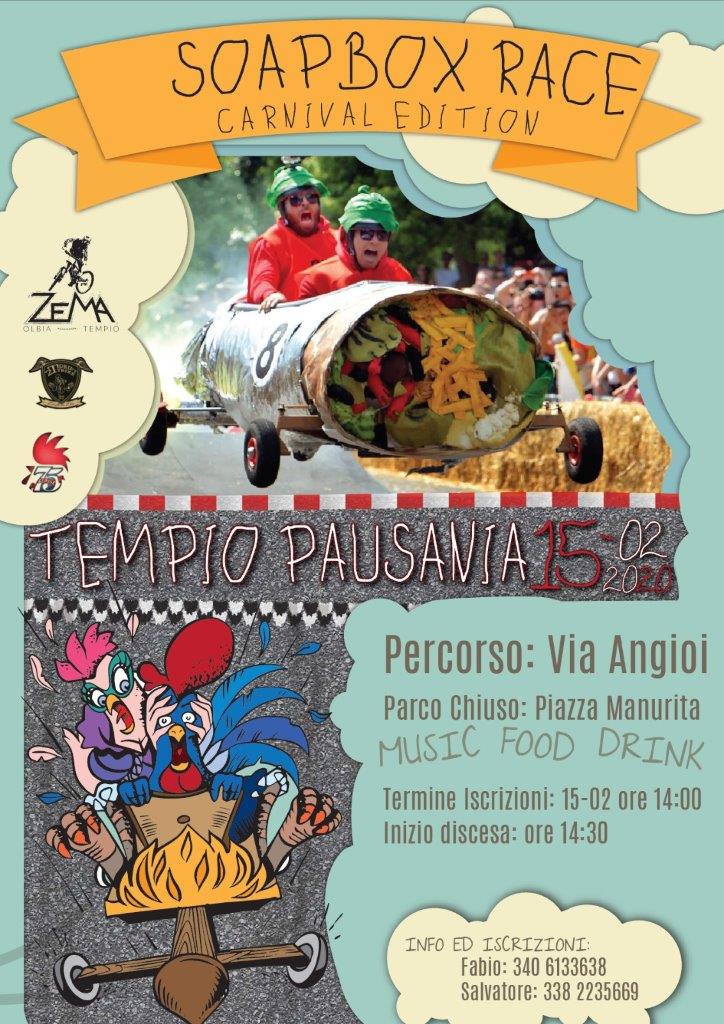 ha inizio “Lu Carrasciali Timpiesu” 2020 con le manifestazioni collaterali del 15 e 16 Febbraio 2020 “E’ arriendi Carrasciali!” Il 15 e 16 Febbraio ecco le manifestazioni collaterali tanto attese di questa edizione 2020 del Carnevale Tempiese, che aprono di fatto “Lu Carrasciali Timpiesu”. Il ricco programma ha inizio alle ore 09.00 di Sabato 15 Febbraio in Largo XXV Aprile con i “MERCATINI DI CARNEVALE”, organizzato dall’ associazione IMPRONTE CREATIVE. Alle ore 14.00 in Via Angioi/P.zza Manurita ZEMA BIKE organizza il 1° SOAPBOX RACE – CARNIVAL EDITION, al quale tutti possono iscriversi attraverso l’apposito modulo messo a disposizione dall’organizzazione, che si allega al presente comunicato stampa, che si concluderà alle ore 18.00 con la presenza di DJ Set. Domenica 16 Febbraio , alle ore 10.30, in Largo XXV Aprile, l’Amministrazione Comunale di Tempio Pausania ha organizzato il RADUNO BANDISTICO, che prevede la successiva esibizione delle Bande alle ore 15.00 nel Centro Storico della Città Gallurese. Dalle ore 11.00, in Corso Matteotti la COLDIRETTI NORD SARDEGNA organizza STREET FOOD A KM 0.0 di CAMPAGNA AMICA. In entrambe le giornate, dalle ore 10.00, in Piazza G. Mazzini la Classe ’71 offre al pubblico LI FRISGIOLI LONGHI mentre la Classe 75, nel Vecchio Caseggiato, propone DRINK FOOD & FUN. La 1^ edizione del 1° SOAPBOX RACE CARNIVAL EDITION si svolgerà seguendo il seguente percorso: “Il percorso sarà situato in Via Angioi e sarà di una lunghezza di circa 200 mt., sarà delimitato da pneumatici, fettucce e balle di fieno, presenterà curve e uno o due piccoli trampolini. L’evento vuole riportare la vecchia tradizione dei carruleddi, ben presenti nelle generazioni passate, che correvano lungo le strade della città, segnando l’asfalto con i loro cuscinetti, la suola delle scarpe nelle frenate disperate e le nostre ginocchia nei casi meno fortunati. A tutto questo, vorremmo unire la spensieratezza e l’allegria del carnevale, con maschere e allegorie, con risate e compagnia, un modo per “giocare” tutti assieme, grandi e bambini… Una giornata da passare in compagnia, all’aperto per tornare a divertirci, socializzare dimenticandoci per un attimo di problemi, lavoro, smartphone, ufficio, email ecc…Sta a voi dare libero sfogo alla fantasia, vi serve qualche attrezzo, un pò di manualità, un costume e tanta voglia di divertirci. La discesa ed i carretti saranno inoltre valutati da una giuria di “esperti”, che giudicheranno l’insieme dell’esibizione, la spericolatezza, la bellezza del carretto, insomma, giudicheranno a “SENTIMENTO”. Alle votazioni della GIURIA verranno sommati inoltre, i tempi del carretto che verrà cronometrato durante la discesa, il carretto più veloce prenderà 10 punti, 9 punti il secondo più veloce e così via.”
