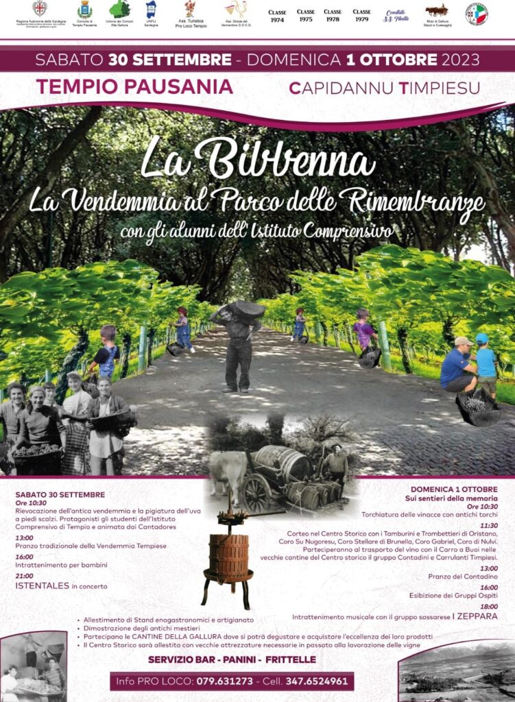 L’associazione turistica Pro Loco ha organizzato, per il Capidannu timpiesu, la due giorni di sabato 30 settembre e domenica 1° ottobre che riporterà al Parco delle Rimembranze la tradizione dell’antica vendemmia, e che vedrà protagonisti gli studenti dell’Istituto Comprensivo di Tempio Pausania.