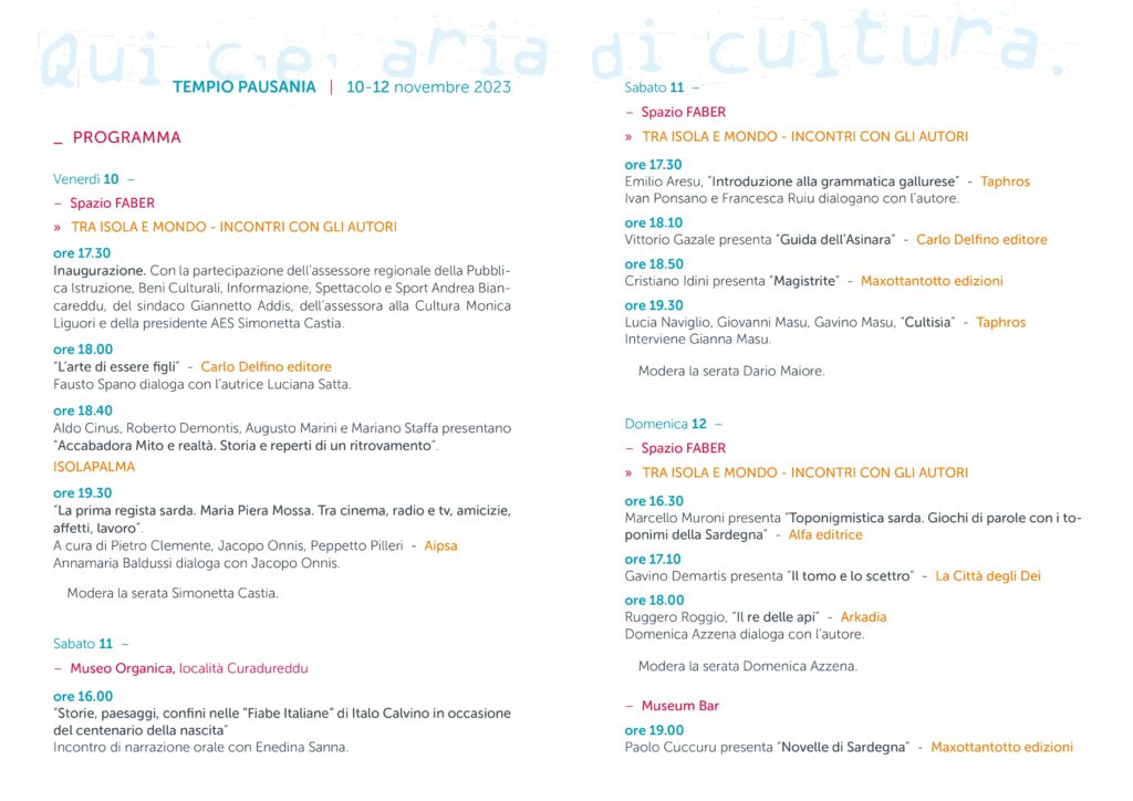 La manifestazione, promossa dal Comune di Tempio, è realizzata dall’Associazione Editori Sardi con il contributo della Regione Sardegna e il supporto e la collaborazione della Libreria Bardamù, del presidio culturale Carta Dannata, del museo Organica e della Cooperativa Athena, che gestisce il sistema bibliotecario Anglona-Gallura e dirige il programma collaterale Storie senza confine.