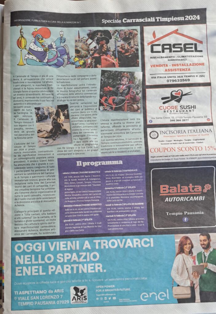 Con questa edizione, il Carnevale di Tempio continua a evolversi, unendo tradizione e innovazione per offrire un’esperienza coinvolgente e indimenticabile a residenti e visitatori.