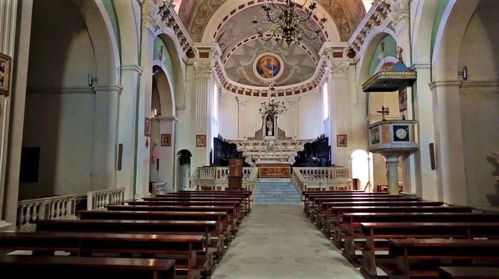 Inside, the church has a nave plan covered by a barrel-vaulted and divided into four bays by under arches; on both sides there are a total of eight chapels (four on each side), also covered by a barrel vault, separated by large Doric pilasters delimiting the bays and supporting a pediment that frames the upper arches. Large windows have been created in the vault curvature in each bay. The presbytery, very deep, is made by a presbytery square area and a large rectangular choir, both barrel vaults and separated by pilasters.