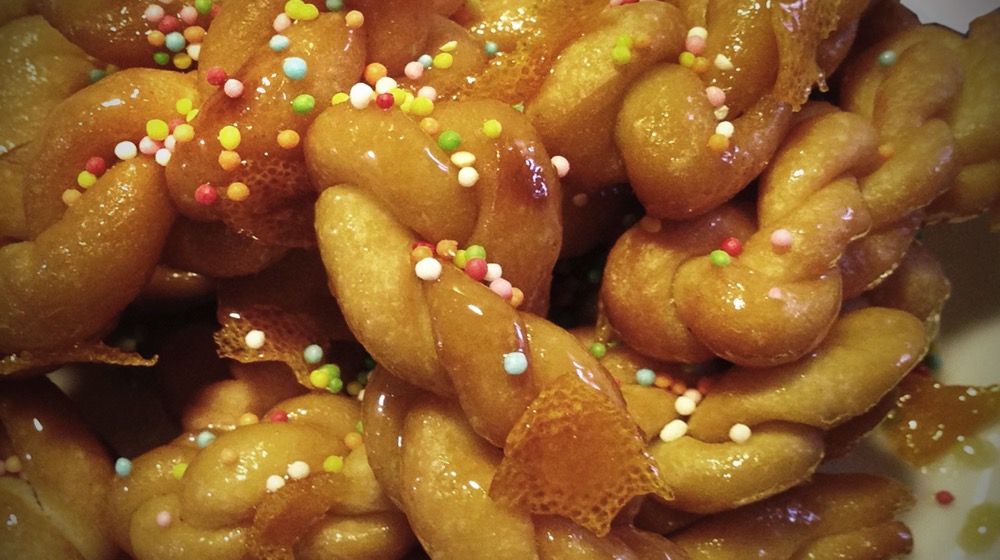 Typical sweet of Tempio’s Carnival, made of dough sticks from mixing flour, water, sugar, lard and eggs, which are twisted on themselves and then deep fried in hot oil until they become golden. After that, we need just to warm honey and orange zest in a saucepan and then put into the pan the Acciuleddi, mixing all togheter until the sweets are well covered with honey.