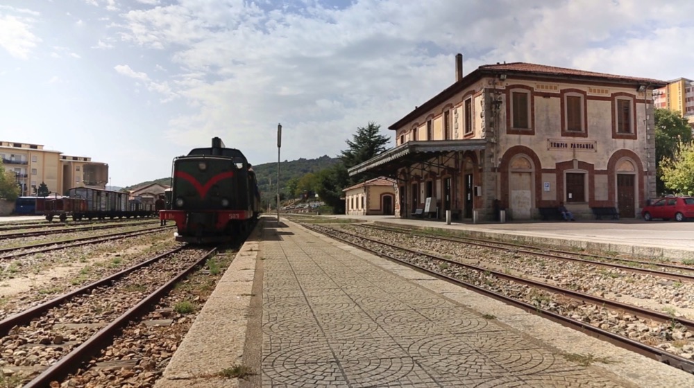 La stazione ferroviaria di Tempio Pausania è stata costruita nel 1931, con il tradizionale modello della stazione di transito, che rivolge il fronte principale all’abitato e si colloca parallelamente ai binari; l’edificio ha un prospetto scandito da cornici e aperture in perfetta corrispondenza con quello verso la strada ferrata, completato da una bella pensilina in ferro.